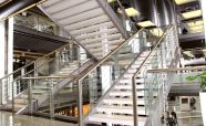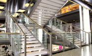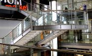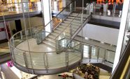 Подвесная металлическая лестница в торговой галерее; Ограждение лестницы из стекла и нержавеющей стали