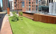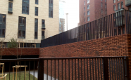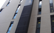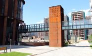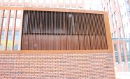Облицовка вентиляционной шахты легированной сталью «COR-TEN». Кортеновые стальные листы имеют бронзовый оттенок, такой эффект достигается в результате окисления легирующих элементов — в этом и есть секрет «вечной» стали с бархатистой фактурой: её окисная пленка не размывается водой, поэтому сталь навсегда сохраняет свой благородно-коричневатый цвет и не поддаётся коррозии