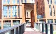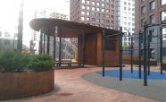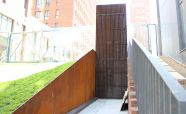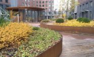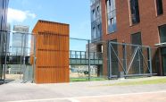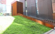 Въездная рампа выполнена из легированной стали «COR-TEN» ЖК «Садовые кварталы». Кортеновые стальные листы имеют бронзовый оттенок, такой эффект достигается в результате окисления легирующих элементов — в этом и есть секрет «вечной» стали с бархатистой фактурой: её окисная пленка не размывается водой, поэтому сталь навсегда сохраняет свой благородно-коричневатый цвет и не поддаётся коррозии