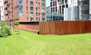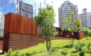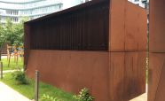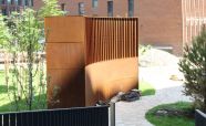 Ограждение из легированной стали «COR-TEN» ЖК «Садовые кварталы». Кортеновые стальные листы имеют бронзовый оттенок, такой эффект достигается в результате окисления легирующих элементов — в этом и есть секрет «вечной» стали с бархатистой фактурой: её окисная пленка не размывается водой, поэтому сталь навсегда сохраняет свой благородно-коричневатый цвет и не поддаётся коррозии