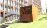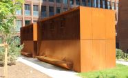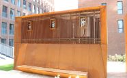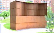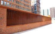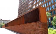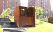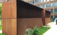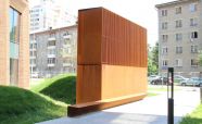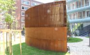 Вентиляционная шахта из легированной стали «COR-TEN» ЖК «Садовые кварталы» IV квартал. Кортеновые стальные листы имеют бронзовый оттенок, такой эффект достигается в результате окисления легирующих элементов — в этом и есть секрет «вечной» стали с бархатистой фактурой: её окисная пленка не размывается водой, поэтому сталь навсегда сохраняет свой благородно-коричневатый цвет и не поддаётся коррозии