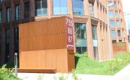 Облицовка вентиляционной шахты легированной сталью «COR-TEN» ЖК «Садовые кварталы» I квартал. Кортеновые стальные листы имеют бронзовый оттенок, такой эффект достигается в результате окисления легирующих элементов — в этом и есть секрет «вечной» стали с бархатистой фактурой: её окисная пленка не размывается водой, поэтому сталь навсегда сохраняет свой благородно-коричневатый цвет и не поддаётся коррозии